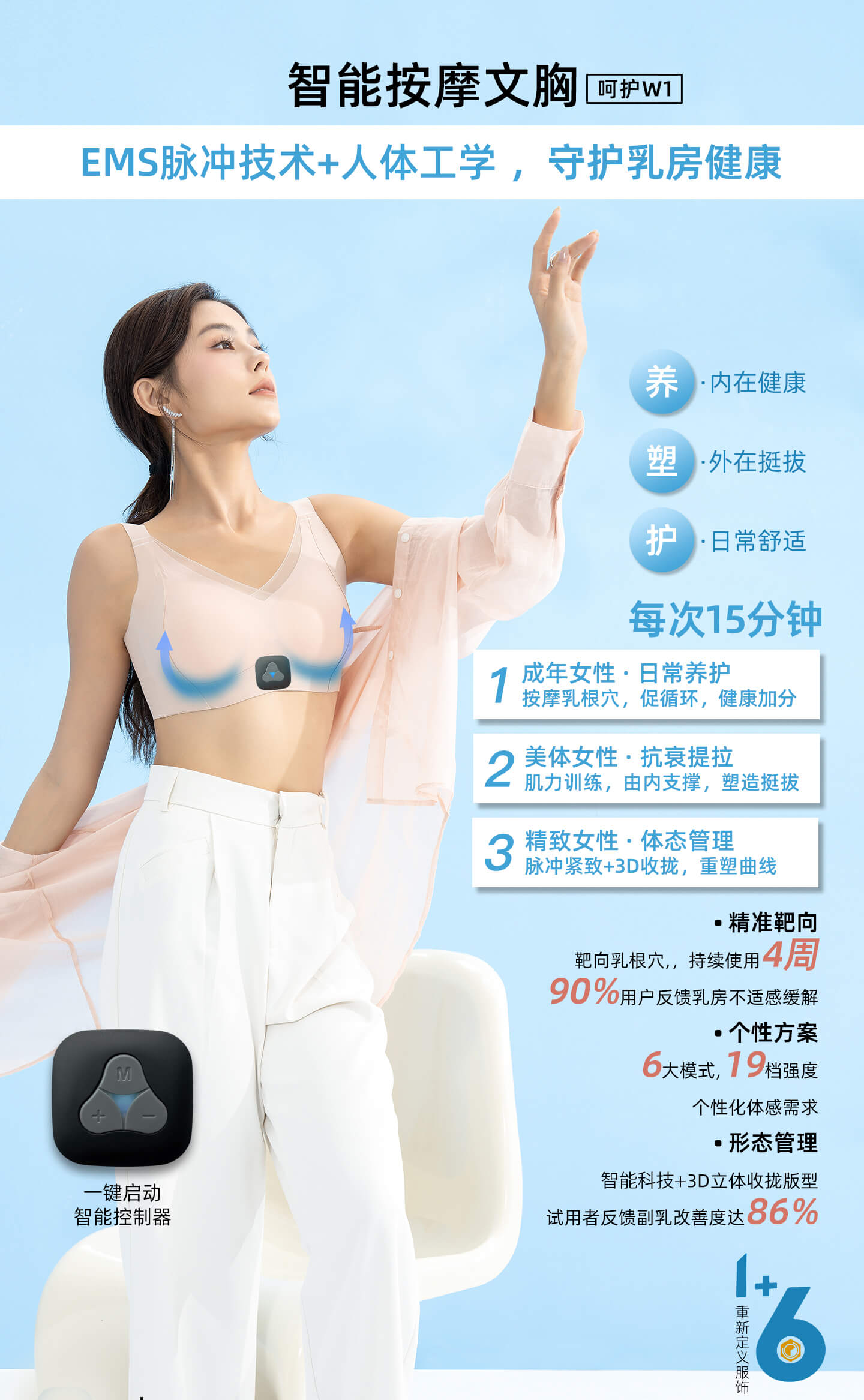 而深圳智能量科技服饰有限公司推出的智能服饰“智能按摩文胸・呵护W1”,正是踩中了这份“轻量护理”的需求。它把EMS脉冲技术藏进了文胸的人体工学面料里,每次只需15分钟,就能通过靶向按摩乳根穴促进循环,既能缓解日常的胸部不适,又能通过肌力训练由内支撑胸型。对职场女性来说,上班时穿它,等于把“护理时间”揉进了工作间隙;对精致女孩而言,它的3D立体收拢版型+脉冲紧致功能,还能悄悄改善副乳、重塑曲线——不用专门抽时间,日常穿戴就把“养”和“塑”都完成了。